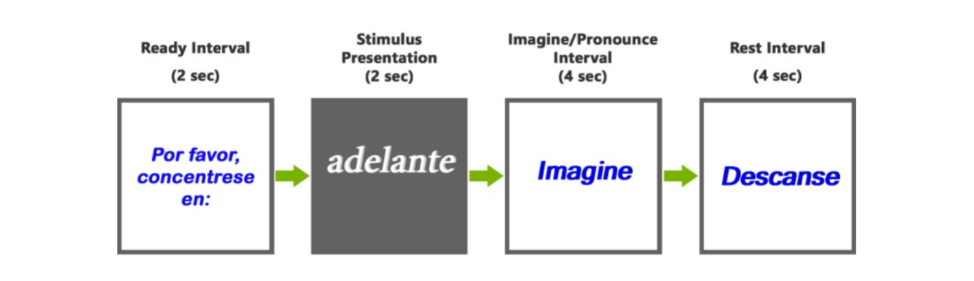 Figure 1 of [1] β trial structure (Ready, Stimulus, Imagine/Pronounce, Rest). Reproduced from the author postprint at the sinc(i)/UNL institutional repository.#